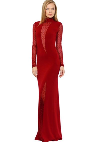 Изумительное бордовое  платье в пол! Модель приталенного кроя, с воротником-стоечкой. Платье выполнено из двух видов ткани: основная –эластичный полиэстер, и ткань сетка – которой декорированы подол, рукава и соблазнительное декольте.