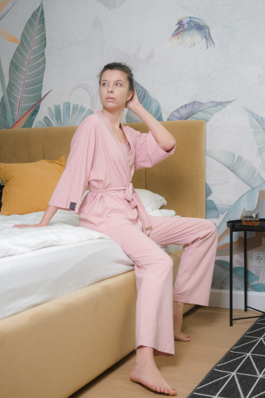 Хлопковый трикотаж премиум-класса, не скатывается и не садится при стирке. В серии Home идеально сочетаются топ, кимоно и брюки. Вы можете выбрать все позиции в одном оттенке или поиграть с сочетанием различных цветов.